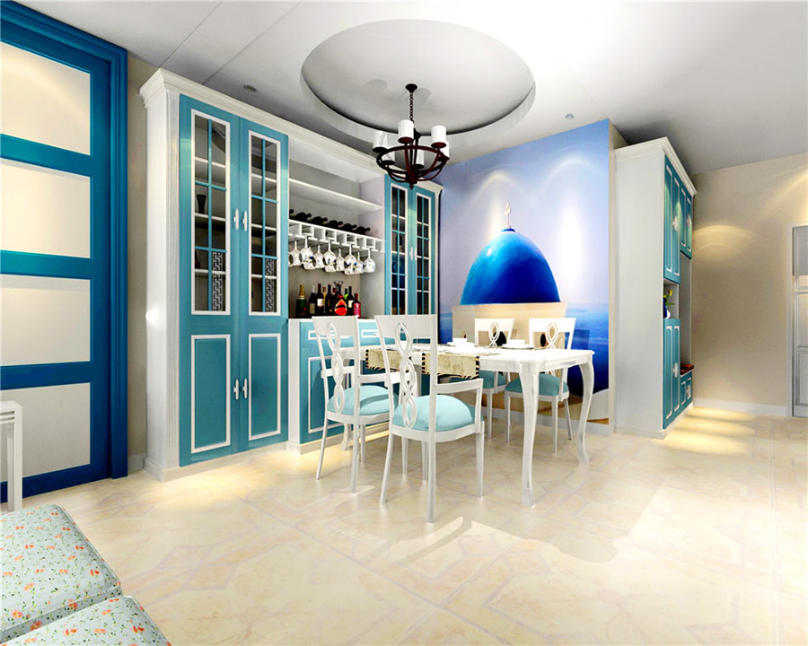 首先被吸引的就是色彩的搭配,顏色大膽卻不會覺得過于浮夸,在圓形吊頂?shù)囊r托下,一切渾然天成,精致的餐桌與餐椅交相輝映,極簡中透露出一股子小清新。