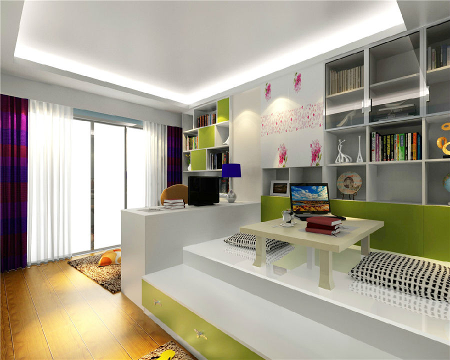 簡(jiǎn)潔流暢的線條中,運(yùn)用大量的護(hù)眼色彩,讓人視覺上更加放松。榻榻米的設(shè)計(jì)造型,獨(dú)立的空間,真正實(shí)現(xiàn)一房?jī)捎,絕對(duì)是小戶型家庭的首選。